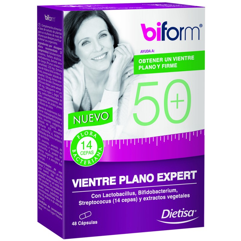 Biform Vientre Plano 50+ es un complemento alimenticio especialmente formulado para mujeres mayores de 50 años, que combina la eficacia de Lactobacillus, Bifidobacterium, Streptococus, y extractos vegetales como la manzanilla y el hinojo.