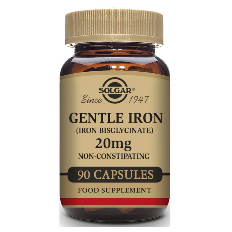 Nombre: Hierro Gentle. Composición: Hierro (bisglicinato ferroso) . Marca: Solgar Envase con: 90 Cáps .De 20 mgr. Duración: 3 meses.