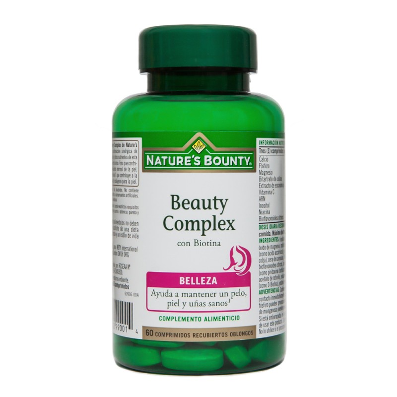La fórmula Beauty Complex de Nature’s Bounty® es una combinación sinérgica de vitaminas, minerales y otros nutrientes de esta fórmula, contiene entre otros 1zinc que contribuye al mantenimiento normal de la piel, pelo y uñas y vitamina C que contribuye a la formación normal de colágeno para la piel.