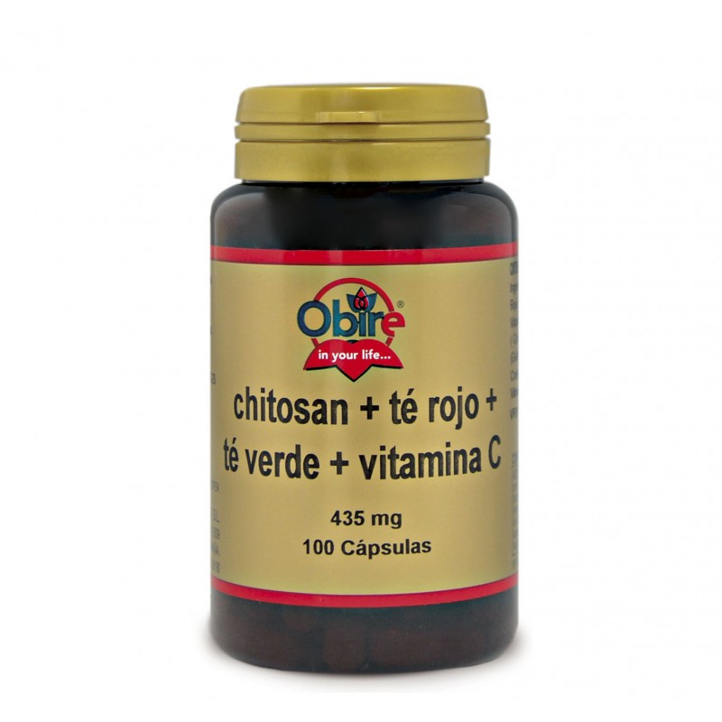 Nombre: Chitosan + té rojo + té verde + vitamina C.Marca: Obire Laboratorio: Bio dis Pharma laboratorios sl Composición: chitosan, planta y vitamina.Presentación: 100 cápsulas 435 mg Apto para: Intolerantes a la lactosa|Puede contener GLUTEN |Contiene CRUSTÁCEOS El Chitosán es un producto que deriva de la chitita, un polisacárido que se extrae del caparazón de los crustáceos. Tiene la capacidad de absorber la grasa en un medio ácido como el estómago y eliminarla sin ser digerida. Es la segunda fibra más absorbente (4-5 veces su propio peso) después de la celulosa y consigue absorber un 15-20% de la grasa que se ha ingerido.