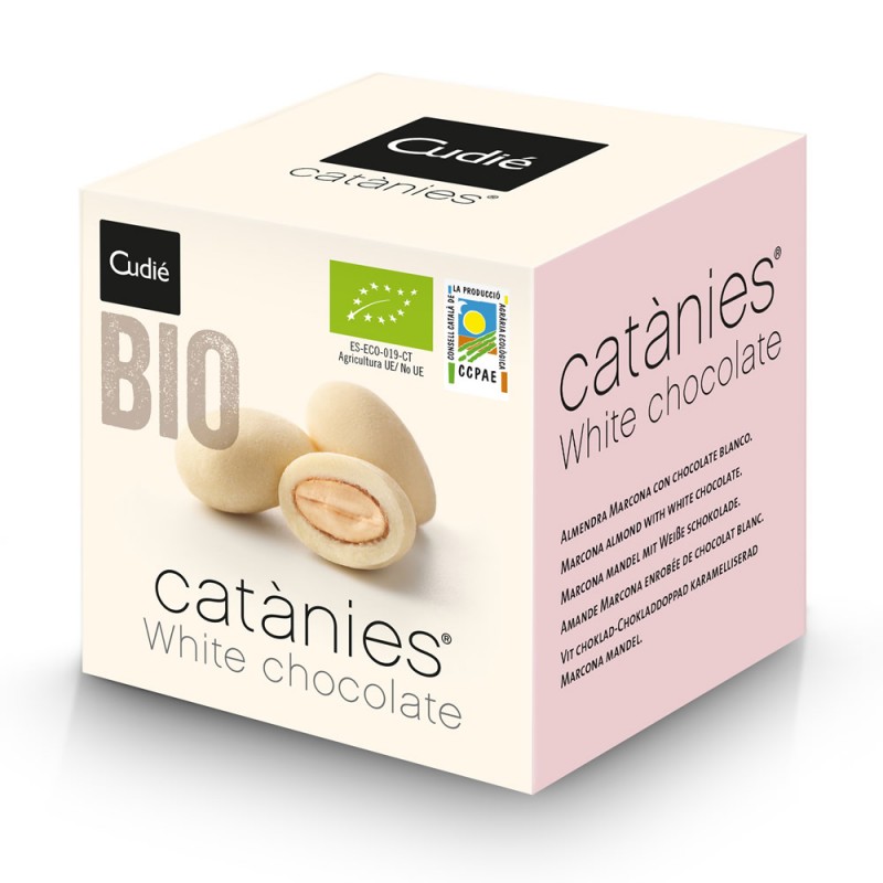 Catanies de Chocolate Blanco SinGluten Bio 80g Cudie. Bombon de almendra marcona procedente de agricultura ecológica con gianduja de chocolate blanco. Elaboradas 100% con productos procedentes de agricultura ecológica.
