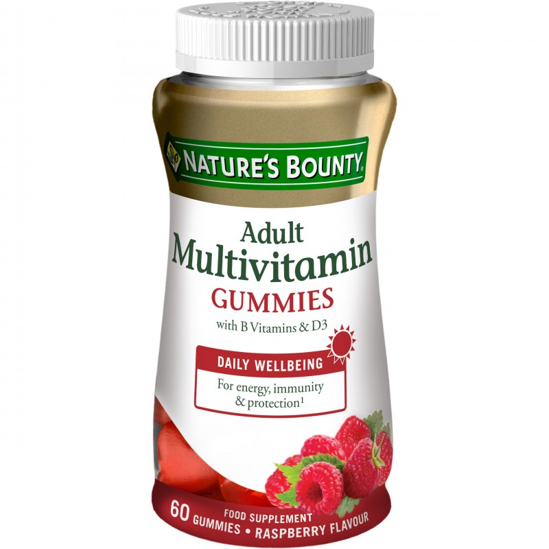 El complemento alimenticio Multivitamínico Adultos Gummies con Vitamina C y D3 de Nature´s Bounty® contiene una mezcla de vitaminas para el apoyo del bienestar general, incluyendo vitamina D3, vitamina C y vitaminas B. Estas gominolas se presentan en una mezcla de sabores de naranja y frambuesa.